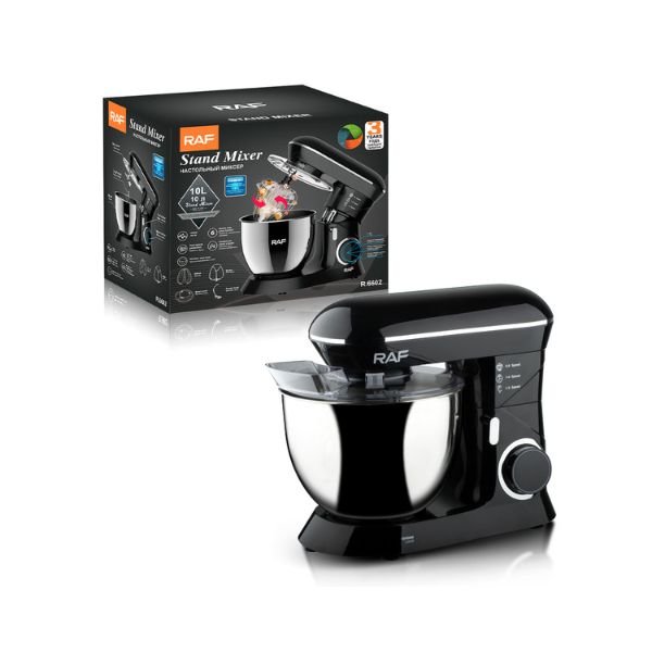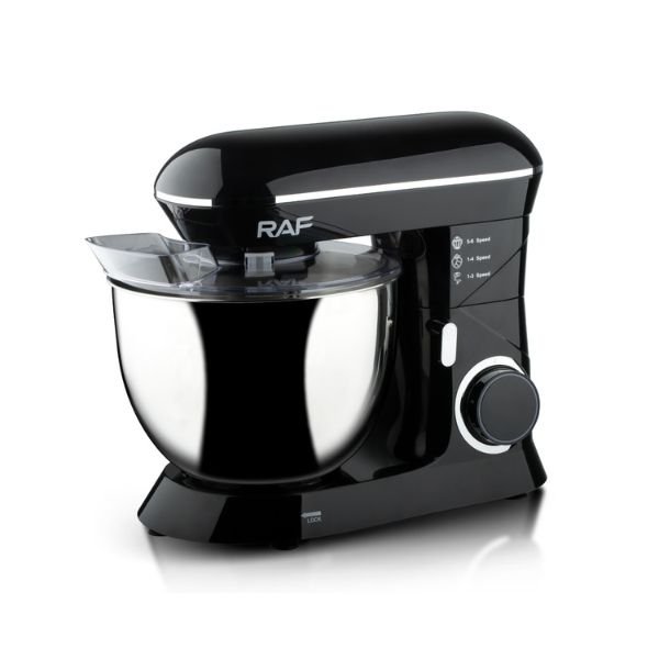 Designed with both performance and comfort in mind, the RAF stand mixer features a sturdy body, an ergonomic handle, and a stable base that reduces movement during operation. The sleek black finish adds a professional look that fits perfectly in modern kitchens.